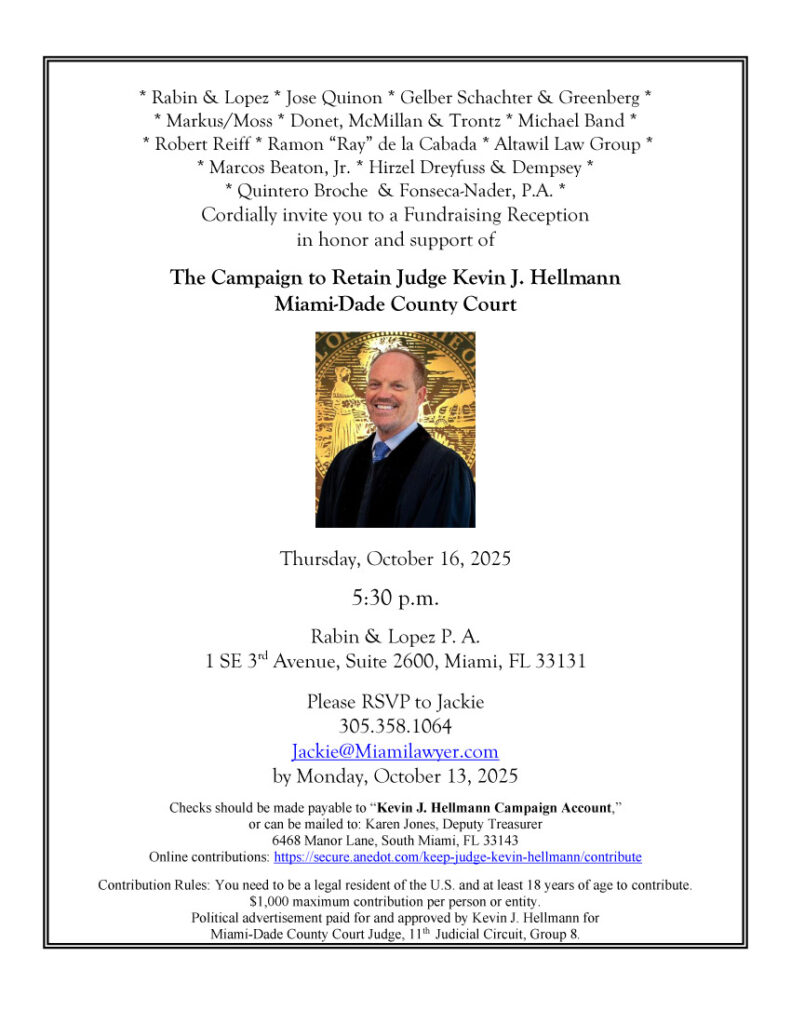 Join us October 16th for a reception supporting Judge Kevin J. Hellmann at Rabin & Lopez P. A.